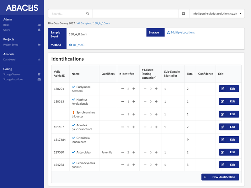Macrobenthic analysis was the first type of sample analysis data supported by ABACUS. Since it's first usage in 2018, macrobenthic analysis features have been continually improved and now possesses a range of features and processes that help to reduce the time taken to record macrobenthic data, improve the quality of the data and provide the tools and features to perform effective data management. All of this is backed up by its usage in real-world projects since 2018.
